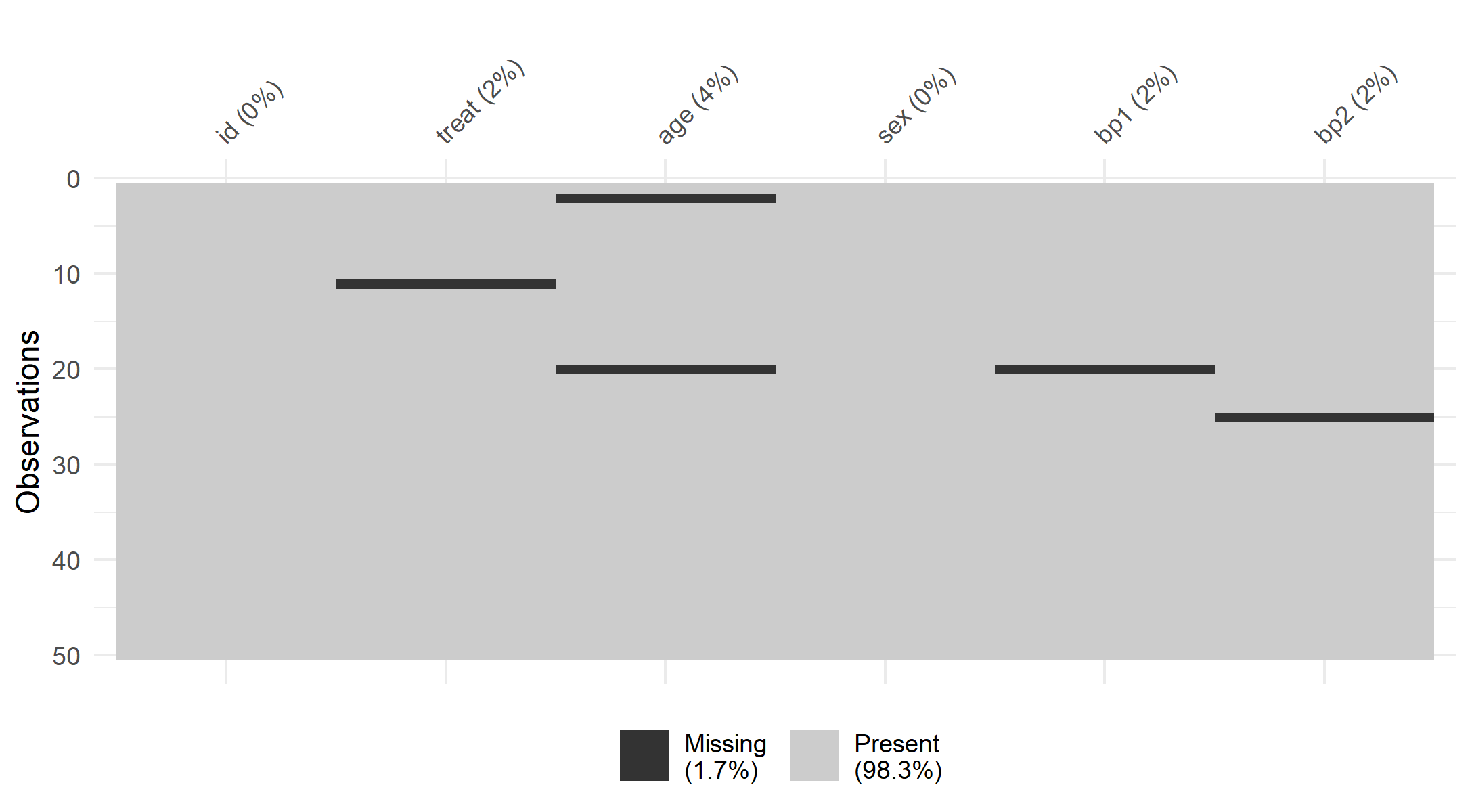 id treat age sex Length:50 Min. :0.0000 Min. : 45.00 Length:50 Class :character 1st Qu.:0.0000 1st Qu.: 57.75 Class :character Mode :character Median :1.0000 Median : 63.00 Mode :character Mean :0.5714 Mean : 81.00 3rd Qu.:1.0000 3rd Qu.: 65.00 Max. :1.0000 Max. :999.00 NA's :1 NA's :2 bp1 bp2 Min. : 87.5 Min. :78.00 1st Qu.: 96.0 1st Qu.:85.20 Median : 98.0 Median :88.40 Mean :102.4 Mean :88.61 3rd Qu.:101.2 3rd Qu.:92.30 Max. :290.1 Max. :99.70 NA's :1 NA's :1